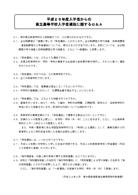 栃木県教育委員会が作成した特色選抜のQ&Aです。