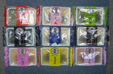 内容としては、写真ではわかりにくいと思いますが、左上から 生八ッ橋・ニッキ・抹茶・黒ごま・塩・チョコレート・いちご・チョコバナナ・さくら です。 これで全種類だそうです。